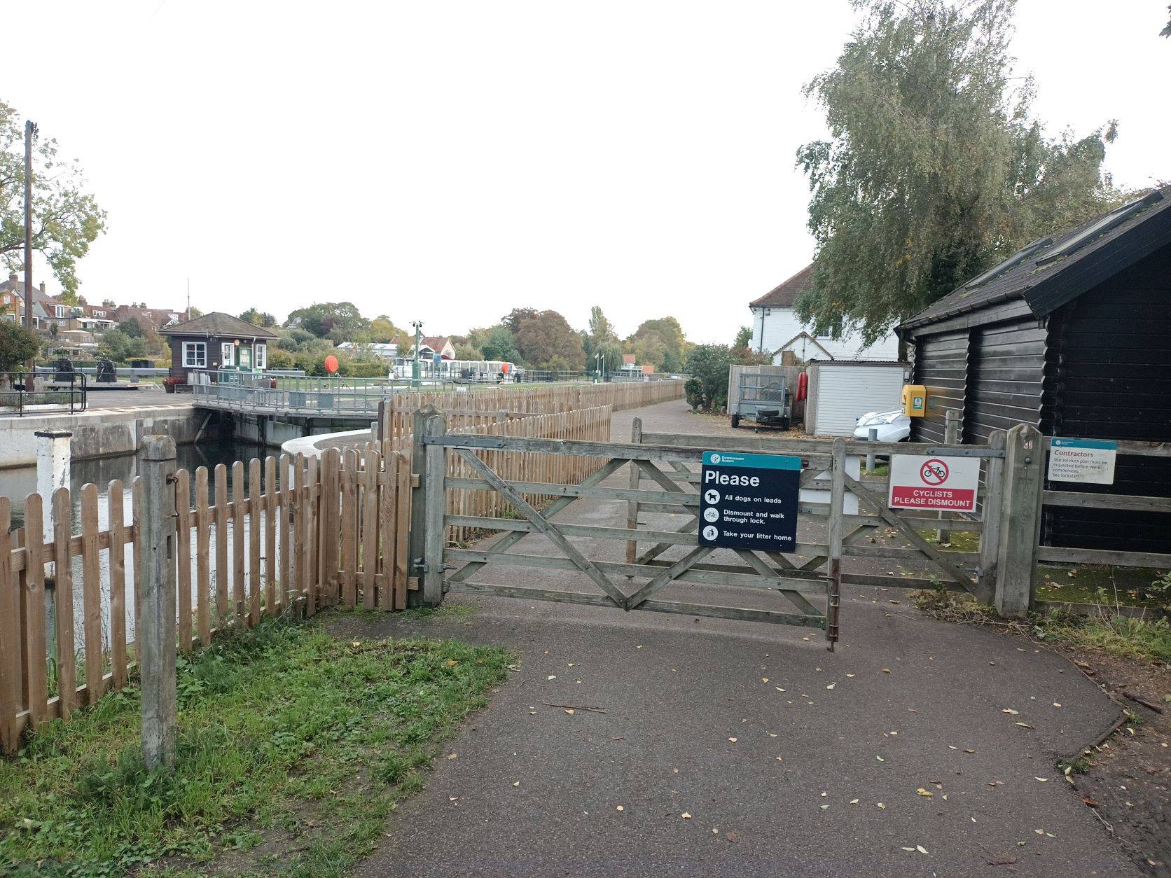 There are gated chicanes at both ends of Sunbury Lock, but the gates can be opened. Cyclists are expected to dismount there.
