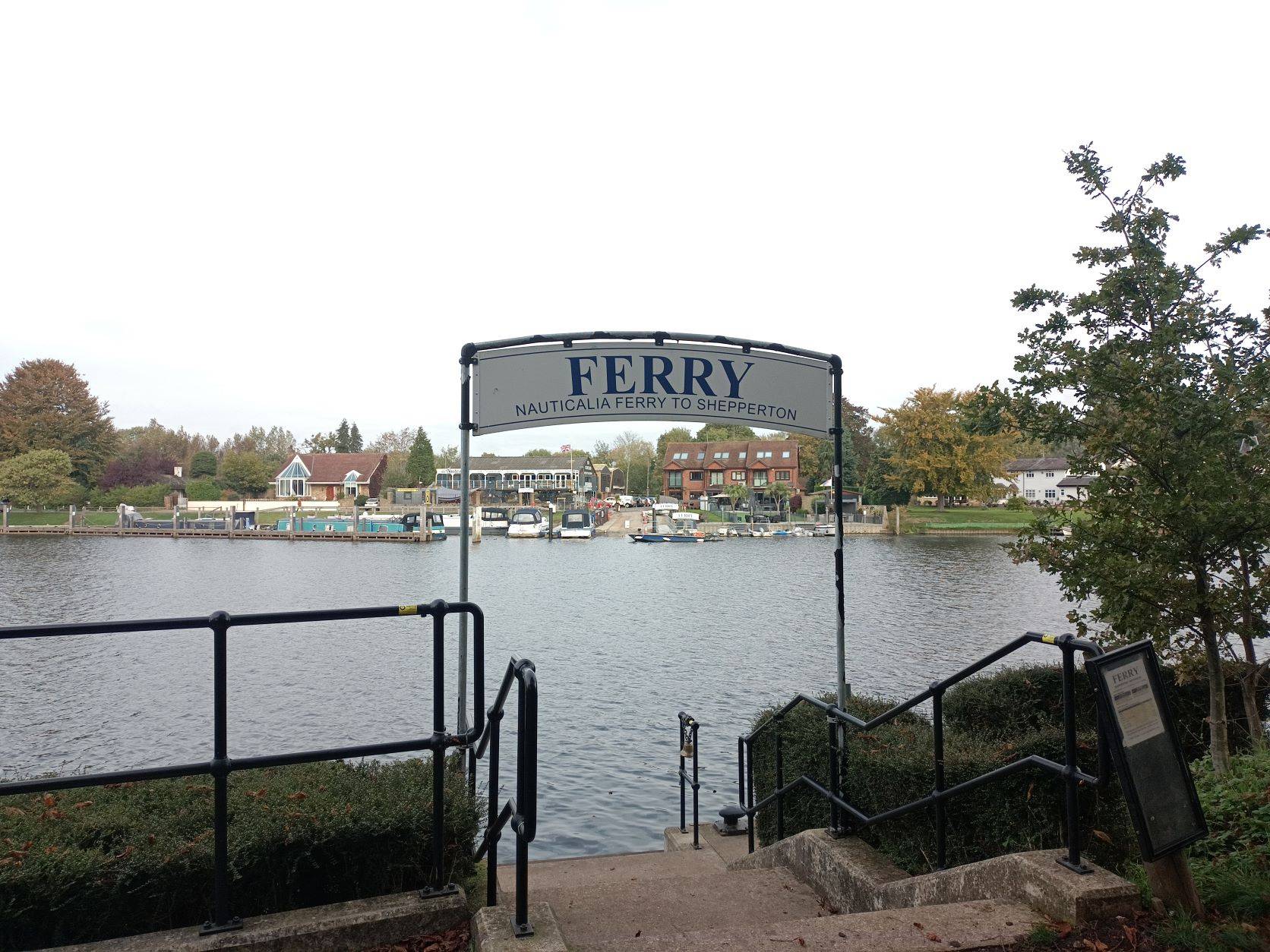 The Thames Path starts at a small car park in Weybridge. A useful foot/cycle ferry just past the start allows crossing to Shepperton and is summoned by ringing a bell. There are also ferries at Sunbury & Molesey.