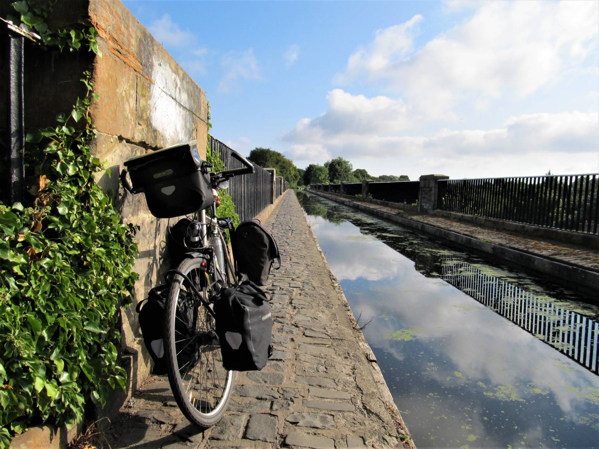 The Union Canal, starts by the Falkirk Wheel and ends Edinburgh, 34 miles away. It is a contour canal, therefore has no climbing. There are three aqueducts and two tunnels and the path along each of those is narrow and cobbled, so it’s suggested that you walk your bike along it. Overall, the towpath is quite narrow , but a tarmac route.